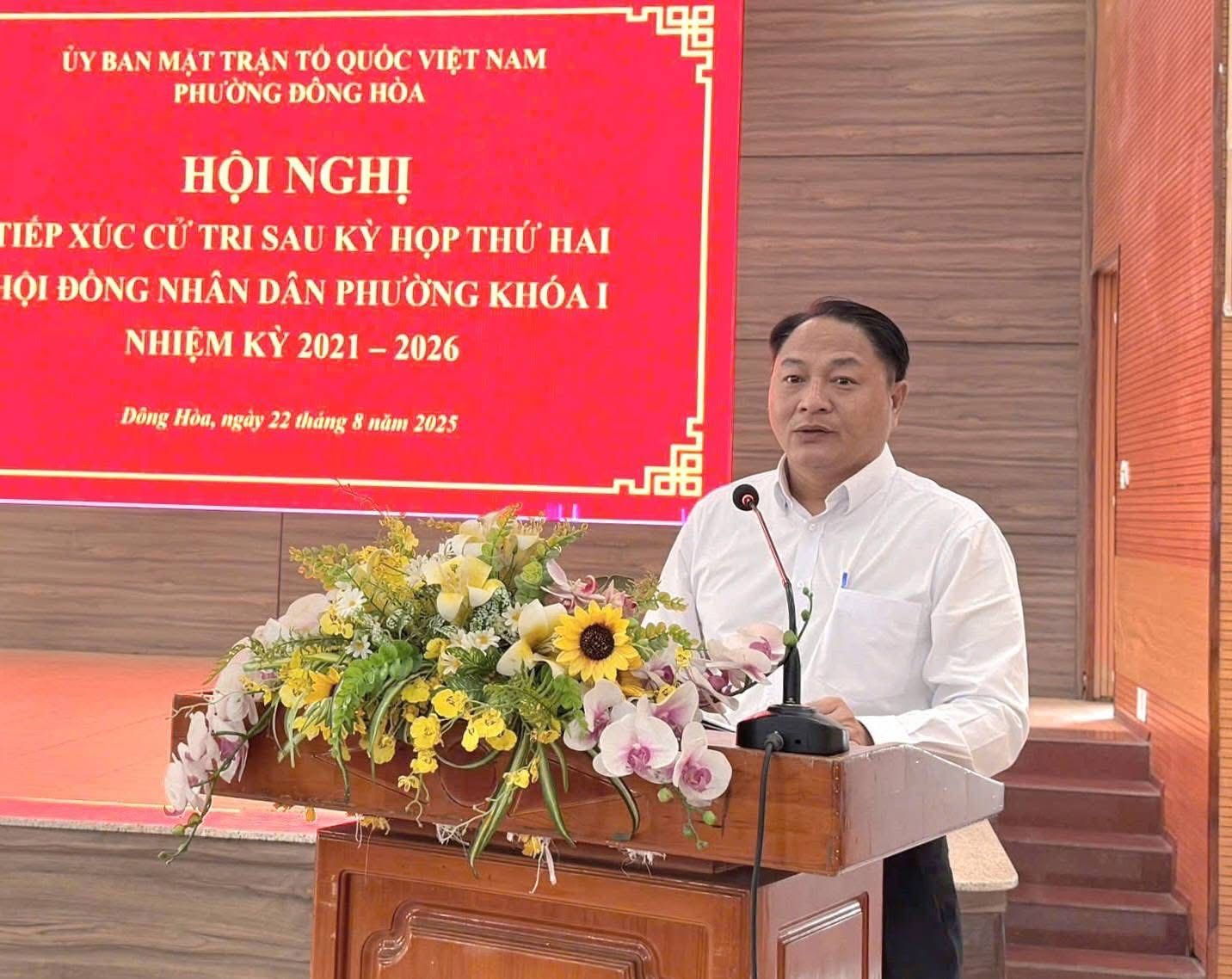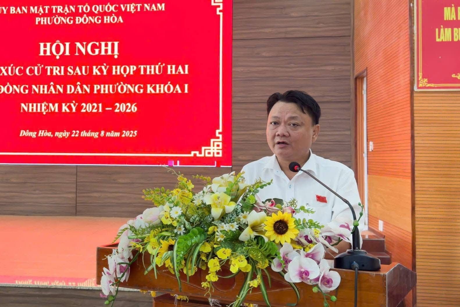 Phát biểu tại hội nghị, ông Nguyễn Công Danh – Bí thư Đảng ủy phường Đông Hòa ghi nhận các ý kiến, đồng thời chỉ đạo các ngành chuyên môn sớm giải quyết những vấn đề thuộc thẩm quyền; tiếp tục theo sát và xử lý các vấn đề cử tri quan tâm. Ông cũng mong muốn nhân dân đồng thuận, chia sẻ trong quá trình triển khai các dự án, góp phần hoàn thiện hạ tầng đô thị và nâng cao đời sống trên địa bàn.