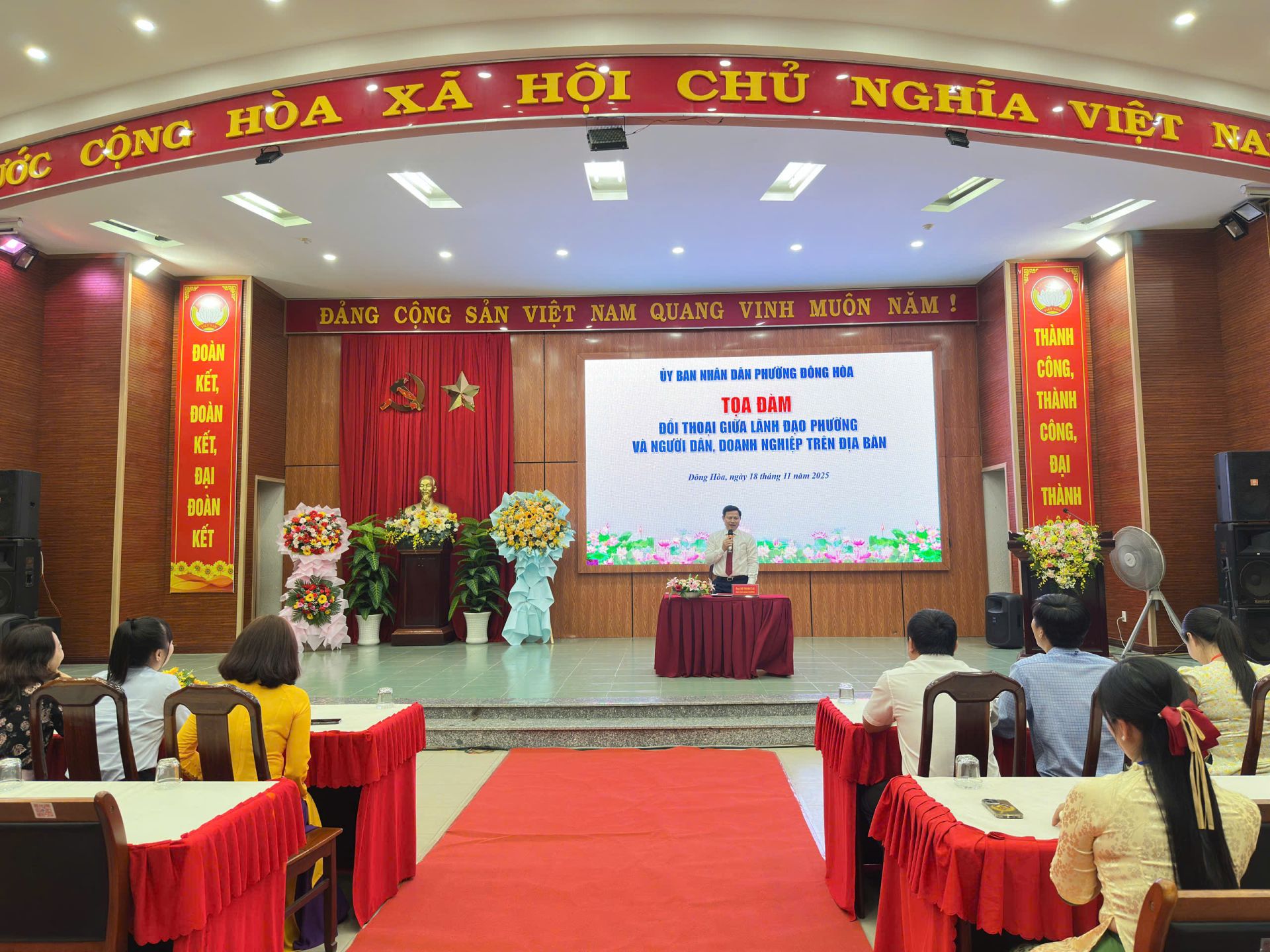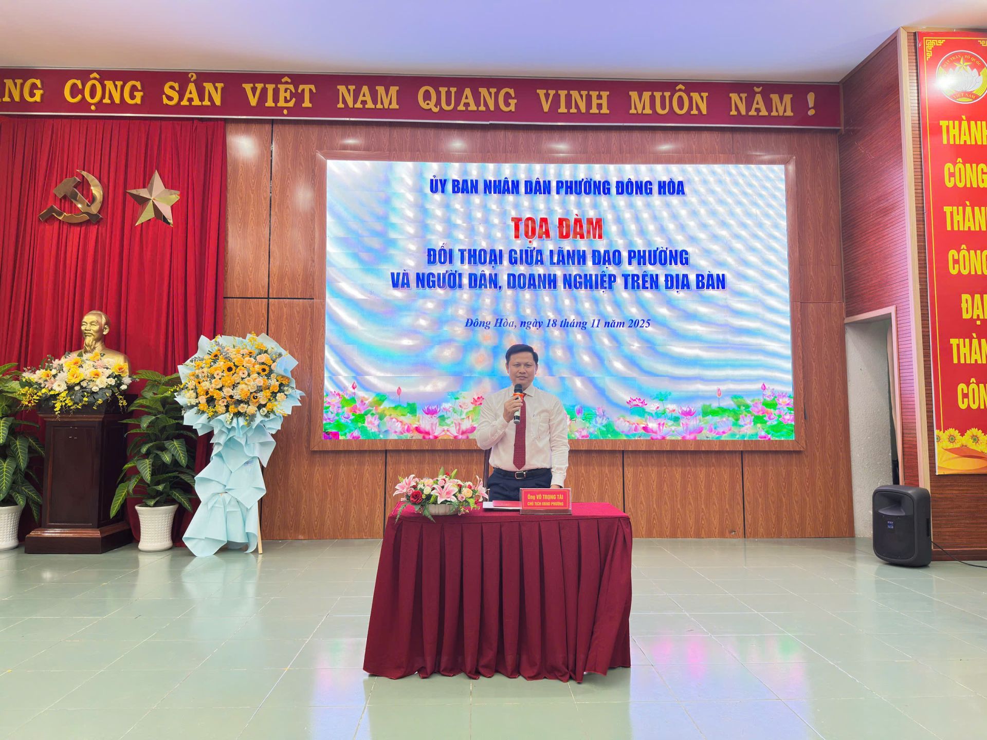 Ngày 18/11/2025, UBND phường Đông Hòa tổ chức buổi Tọa đàm đối thoại giữa lãnh đạo phường với người dân và doanh nghiệp nhằm tạo kênh trao đổi trực tiếp, giúp chính quyền nắm bắt kịp thời những phản ánh từ thực tiễn đời sống và hoạt động sản xuất – kinh doanh trên địa bàn.