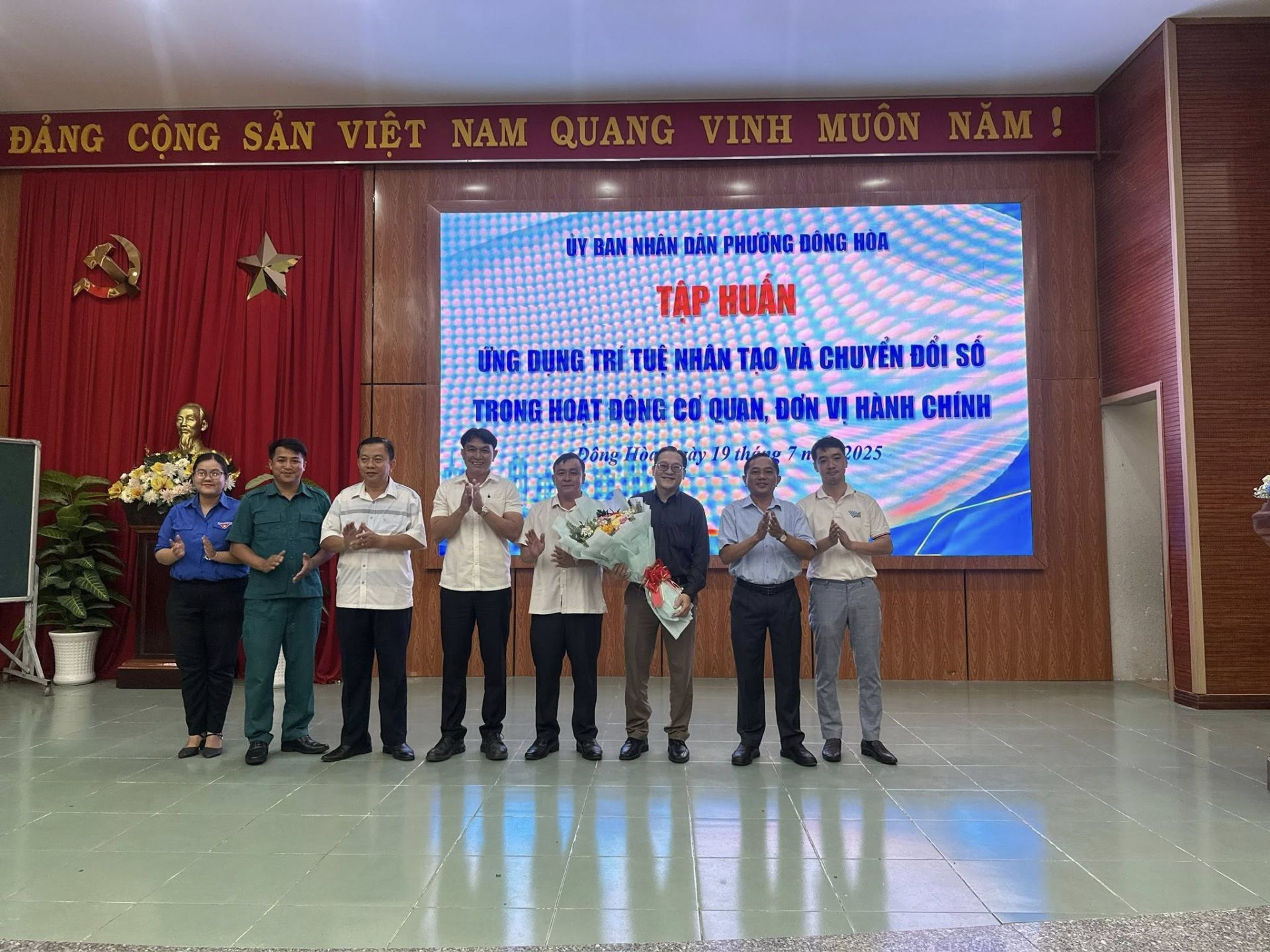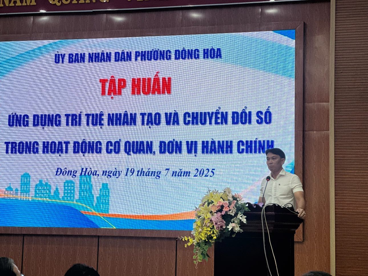 Sáng ngày 19/7/2025, UBND phường Đông Hòa tổ chứ lớp tập huấn chuyên đề: “Ứng dụng trí tuệ nhân tạo và chuyển đổi số trong hoạt động cơ quan, đơn vị hành chính”. Đây là hoạt động thiết thực nhằm nâng cao nhận thức, kiến thức và kỹ năng cơ bản về công nghệ số, trí tuệ nhân tạo (AI) cho đội ngũ cán bộ, công chức, viên chức và người hoạt động không chuyên trách trên địa bàn phường.